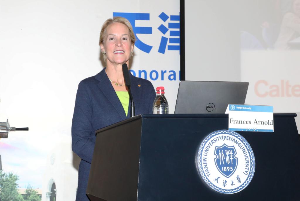 16日上午,阿诺德来到了天津之行的首站——天津大学。在这里她受聘为天津大学名誉教授。授予仪式在天津大学卫津路校区科学图书馆举行。天津大学党委书记李家俊、副校长元英进出席了授予仪式。在仪式上,李家俊向阿诺德颁发了天津大学名誉教授荣誉证书及纪念牌。会后,阿诺德做客天津大学北洋大讲堂,为现场500余名师生做了题为“进化创新:将新化学带入生活”的学术报告。
