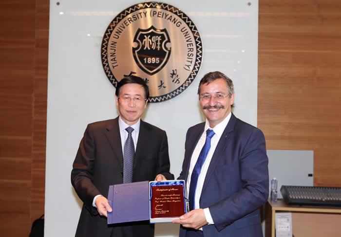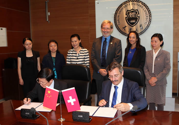 Hangartner教授受聘我校名誉教授的授予仪式和两校的协议签署仪式同时进行。我校药学院院长Jay Siegel首先介绍了Hangartner校长的学术成就。Hangartner教授在细胞凋亡的执行、信号通路调控、DNA损伤激活以及吞噬死亡细胞尸体的机制方面开展了深入的研究,极大地促进了人们对细胞凋亡的理解。他的成就得到了世界同行的高度认可,也将对我校相关学科的发展起到重要作用。随后,李家俊向Michael Hengartner校长颁发天津大学名誉教授证书及木牌。