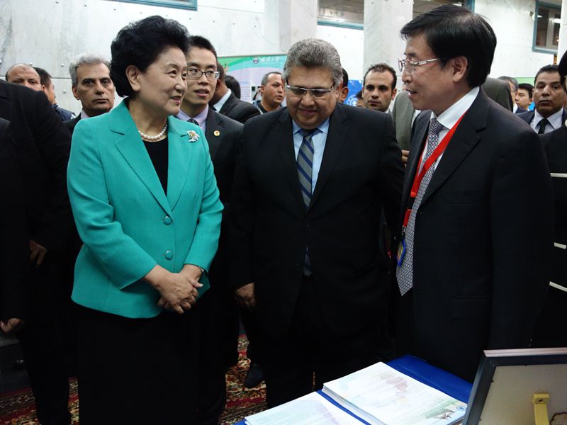 刘延东在埃及高教部长的陪同下参观了我校展位,她特别向埃及高教科研部长希哈介绍说天津大学是中国第一所大学,是中国历史最悠久的,已经有120年历史。希哈与李家俊亲切握手,双方进行了简短但热情的交流。