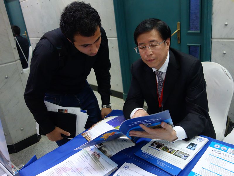 在中国高等教育展上,刘延东总理为展会剪彩。在我校的展位前人头攒动,热情的埃及学生用不同水平的中文提出了各种有关专业课程和奖学金等方面的问题,李家俊一行为他们做了耐心细致的讲解。
