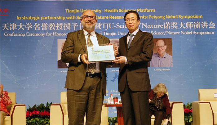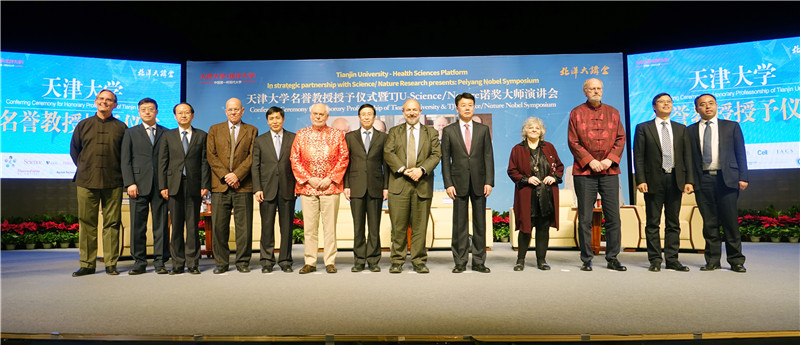 “今天我们又有了3位新成员加入天津大学。”“他们中,一位选择了一个别人认为都不可能成功的领域并持之以恒地最终获得了成功。”“另一位则有着惊人的专注力,勇于带领团队克服一切困难。”“还有一位作为金属有机化学领域的专家发明了非常有趣的聚合物,而这些聚合物都是非常伟大的发明。”在天津大学药学院院长杰伊·西格尔的娓娓介绍下,3位诺贝尔奖得主在热烈的掌声中走上了讲台。