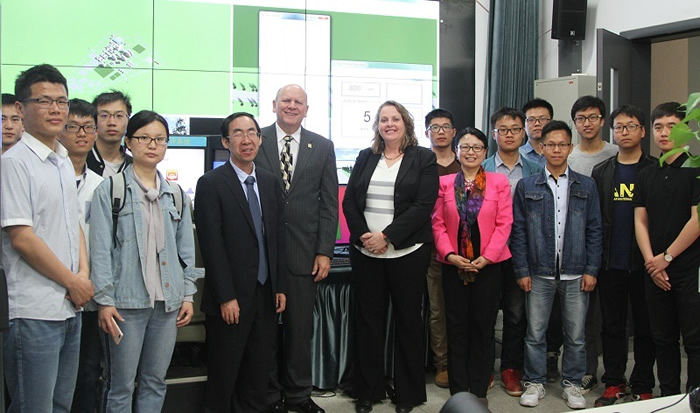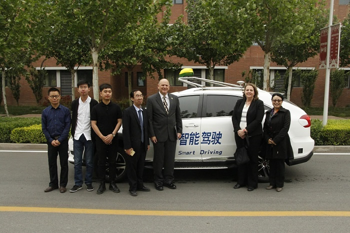 John F·Reid一行还参观了天津大学无人驾驶交叉平台。机械学院谢辉教授介绍了无人驾驶在车辆数据采集、传感器信息融合以及深度学习在驾驶大脑设计上的工作进展。在无人驾驶虚拟仿真平台和驾驶模拟器上进行软件算法上的验证,用多台服务器进行图像的深度学习网络训练。John F·Reid说到:“无人驾驶需要格外重视数据的采集和利用。”