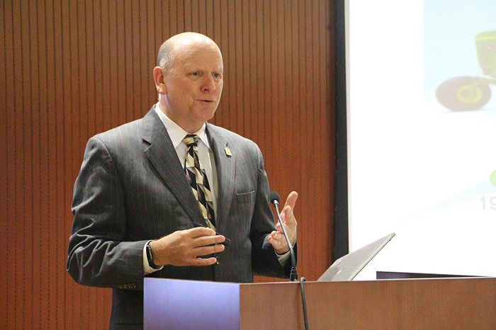 授予仪式上,钟登华介绍了学校历史发展、师资规模以及双校区运行情况,着重介绍了学校的国际化发展,特别是药学院作为国际化示范学院的建设情况。他进一步回顾了学校与约翰迪尔公司在人员交流、技术创新以及共建“约翰迪尔—天津大学创新实验室“等方面的合作成果,希望今后与该公司在机械、自动化以及水利等领域推动更多合作。