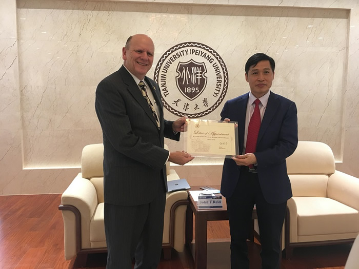 John F·Reid先生对于获聘天津大学客座教授表示非常荣幸。他表示,约翰迪尔公司与天津大学愿景相同,过往五年与天津大学机械学院在人员、科研等领域已经开展了很多双赢合作。鉴于双方在动力总成、无人驾驶、电子、机械、水利工程等很多领域具有相关性,未来合作潜力巨大希望。他希望,通过此次获聘天大客座教授的契机,进一步拓展和深化双方的交流与实质性合作。
