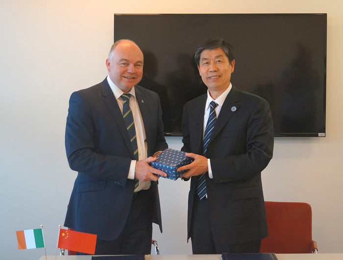 访问都柏林大学期间,校长Andrew Deeks会见代表团一行。Deeks校长回顾了双方近年来的合作情况,尤其是在土木工程和精密制造等领域教授互访、科学研究等情况。他指出,都柏林大学涵盖学科门类广,重视交叉学科发展以及科学研究与教学紧密结合,希望双方在优势领域进一步深化合作。刘建平简要介绍了学校在科学研究、学科建设、人才培养以及国际合作等方面的近期发展情况,指出我校十分重视跨学科发展和国际合作,与都柏林大学在工程类专业有着很高的匹配度,希望通过强强合作,辐射区域社会经济发展。双方还就在学生联合培养、建设联合研究中心以及高端人才引进等方面进行了充分讨论,确定以高水平科研合作和双学位项目为抓手,切实推进国际合作可持续发展。随后,刘建平和Deeks校长共同签署了合作谅解备忘录以及学生交换协议。