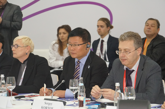 参加开放式发展论坛期间,元英进应邀出席了中俄校长圆桌会议。会议由俄罗斯乌拉尔国立经济大学校长主持,俄罗斯教育科学部部长利瓦诺夫致辞。利瓦诺夫部长指出,中俄两国高校应相互借鉴经验,开展国际合作,协同发展。随后,与会中俄两国高校校长就加强中俄两国高校合作以及教育与科研紧密结合等议题进行了探讨。元英进与参会嘉宾分享了我校在创新创业中的探索和实践,并重点介绍了该项工作中依托技术转移中心、异地研究院、校企联合机构以及学科性公司这四种驱动力取得的显著成果。与会俄方高校积极回应了元英进副校长的发言,肯定了我校的探索实践具有一定的借鉴意义,同时表达了希望与我校建立合作联系的意愿。第三届莫斯科国际创新发展论坛由俄罗斯联邦政府主办,中方应俄方邀请作为唯一“伙伴国”参加。