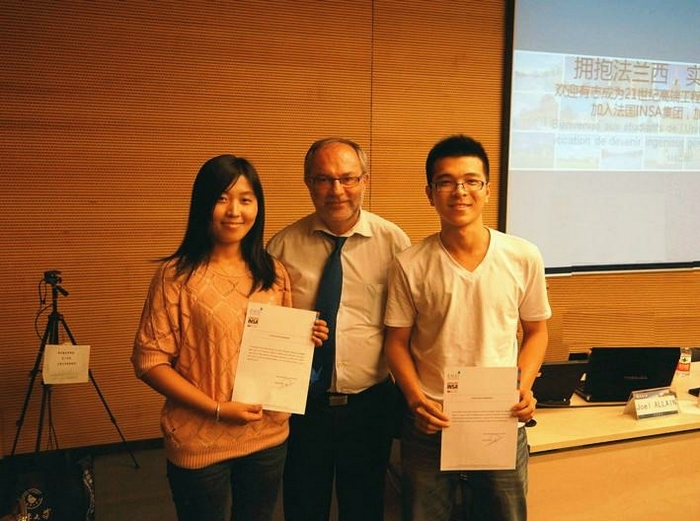 当天,Joel ALLAIN校长在会议楼举行了布尔日高等工程师学校学生项目宣讲会,为我校学生详细介绍了硕士生双文凭项目的相关信息,并现场为我校经管学部学生李峰、孙晓雪颁发了录取通知书。