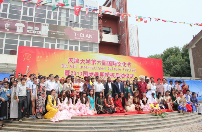 5月25日,由天津大学国际教育学院和国际合作与交流处联合主办的第六届“国际文化节”暨2013国际暑期学校启动仪式在学一食堂前广场举行。他们来自不同的国家和地区,有着不同的文化背景,更有独具特色的历史、文化在天津大学学习的来自近百个国家的留学生们不仅以歌舞形式展示世界不同民族的文化特色,还搭起数十个展台,通过丰富的图片、各国工艺品、风味美食等形式传播各国文化,各具民族特色的别样展示使广场俨然成了“迷你世博会”,各国风土人情在这里激情碰撞,为中、外学生搭建一个交流、展示、共建友谊的平台,场面热闹非凡。同时,本次文化节中还有民族食品义卖活动,留学生们将把义卖的部分所得捐给雅安灾区。 据了解,天津大学是我国最早接受外国留学生的院校之一,目前共有来自亚洲、非洲、欧洲和美洲97个国家的606名留学生在学校学习,每年暑假还有来自美国、韩国、俄罗斯等国家的暑期学校交流项目。他们来自不同的国家,有着不同的文化背景,更有独具特色的历史、文化,成为校园中最靓丽的一道风景。