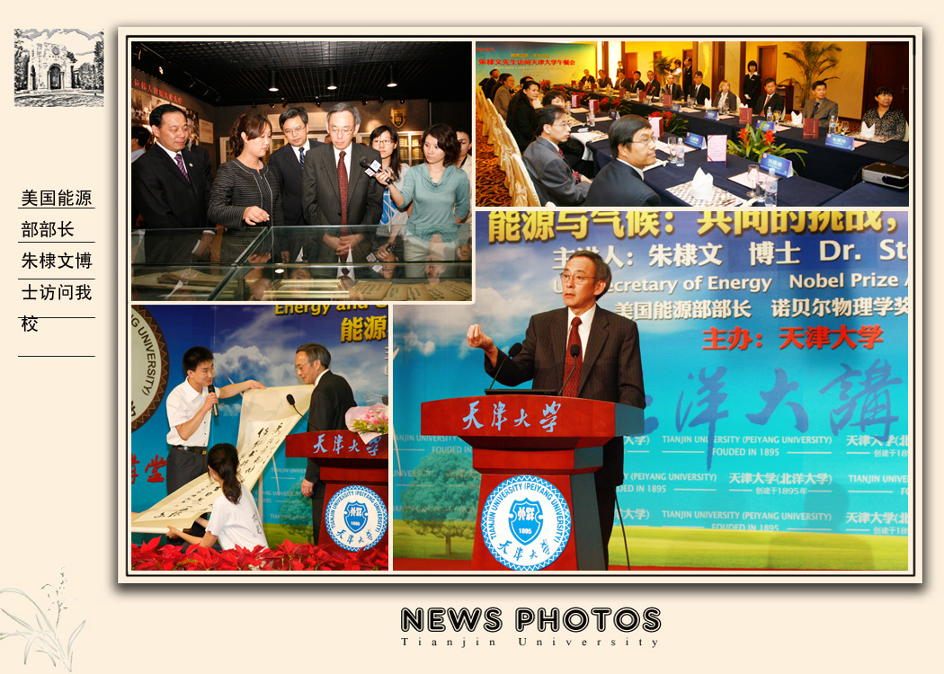 7月17日,应天津大学校长龚克邀请,美国能源部部长、诺贝尔物理学奖获得者朱棣文来天津大学访问,与天津大学科研人员就能源领域的研究进行了座谈,参观了天津大学档案馆,并作客北洋大讲堂,为师生作了题为《能源与气候:共同的挑战,共同的机遇》的报告。