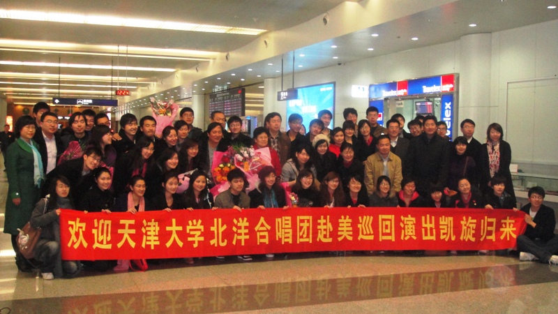 28日中午,北洋合唱团的41名团员和8名带队校领导及教师从纽约经由韩国仁川机场飞抵天津。校党委副书记李义丹及组织部、宣传部、工会、人事处、外办、校团委等部门负责人一行在出站口迎接,热情地为陆续走出机场的师生送上鲜花。此行带队赴美巡演的校党委副书记、纪委书记邢敏在机场对巡演活动做了简单总结,称赞赴美演出的团员不畏艰苦,圆满完成了演出任务,为学校赢得了荣誉。随后,李义丹发表了热情洋溢的讲话,代表学校对团员们表示慰问,并对合唱团此行的出色表现给予了高度评价。最后,全体师生在机场合影留念后乘车抵达学校。