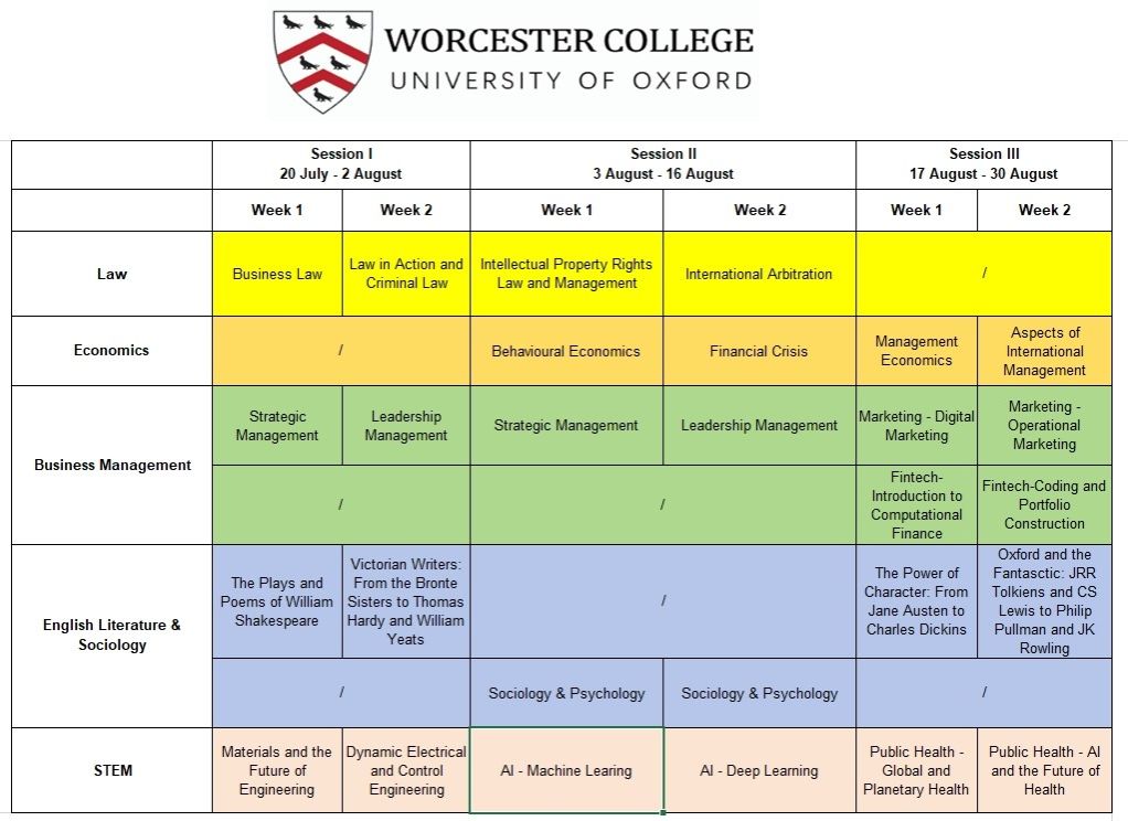 牛津大学Worcester College暑期证书项目提供多个学科板块的学术课程,包括法律、经济、商务、英国文学、STEM等。暑假开设三期,一期2周,每两周选择一门专业课程,学生可以选择参加为期两周,四周或者六周的密集学术课程,与全球学生一起体验牛津大学的教学模式和学术氛围。