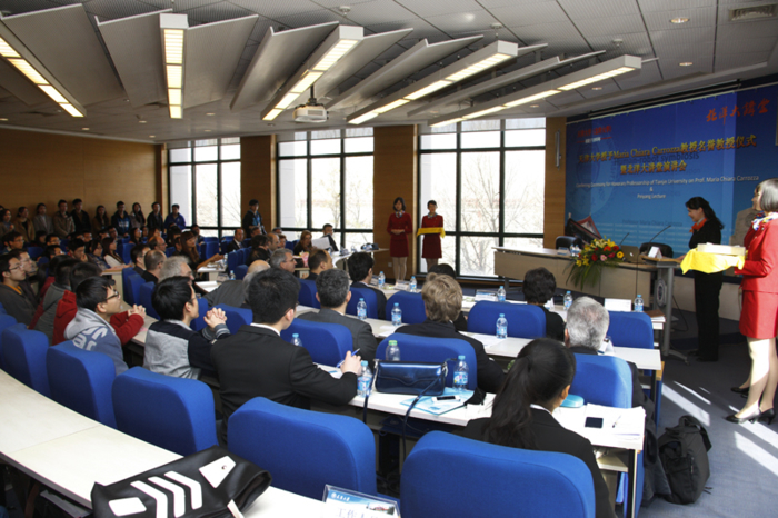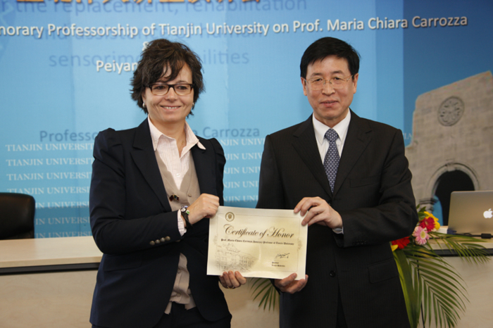 On November 16, Professor Maria Chiara Carrozza,Minister of Education, Universities, and Research of the Republic of Italy, was conferred an honorary professorship from Tianjin University (TJU), becoming the first minister to be a TJU honorary professor. TJU President Li Jiajun conferred the Certificate of TJU Honorary Professorship upon her. Attendees of the event included Mr. Gianluigi Benedetti, Diplomatic Counselor of Italian Embassy, Mr. Alberto Di Minin, Advisor of Innovation Policy for the minister, Mr. Augusto Massari, Commercial Counselor, Professor Plinio Innocenzi, Science and Technology Counselor, and over 100 faculty and student representatives from TJU related schools and offices.
