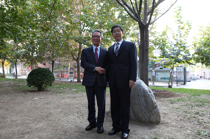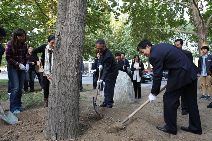 Afterwards, the TJU Chairman of the University CPC Standing Committee Liu Jianping and Dr. Kim Hyung-oh jointly dug the ground and watered the “China-South Korean Friendship Tree”. The tree was planted by Dr. Kim Hyung-oh when he visited TJU in April, 2010. In November, 2009, he visited TJU and was awarded an honorary doctorate.