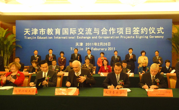 On February 26th, Tianjin Education International Exchange and Cooperation Projects Signing Ceremony was held in Tianjin Guest House. Gaoli Zhang, Secretary of the CPC Tianjin Municipal Committee and Xingguo Huang, Mayor of Tianjin greeted the guests from home and abroad. Leaders from Tianjin Municipal Government, Jiajun Li, President of Tianjin University and Ke Gong, President of Nankai University attended the ceremony.