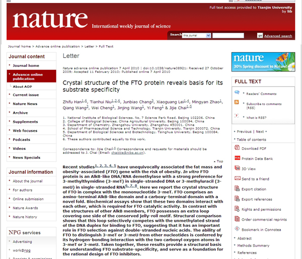 Current researches consistently show that obesity has close connection to human genes. One “FTO” gene, vividly called the “Fat Gene”,might probably be the cause of obesity. Recently, scientists from Tianjin University and Beijing Institute of Biological Sciences successfully revealed the crystal texture of FTO Protein, and they further proved the protein to be a kind of DNA Demethylase. This groundbreaking research was published in Nature online on April 8. The research will provide the basis for the development of drugs for obesity with Chinese IPR.